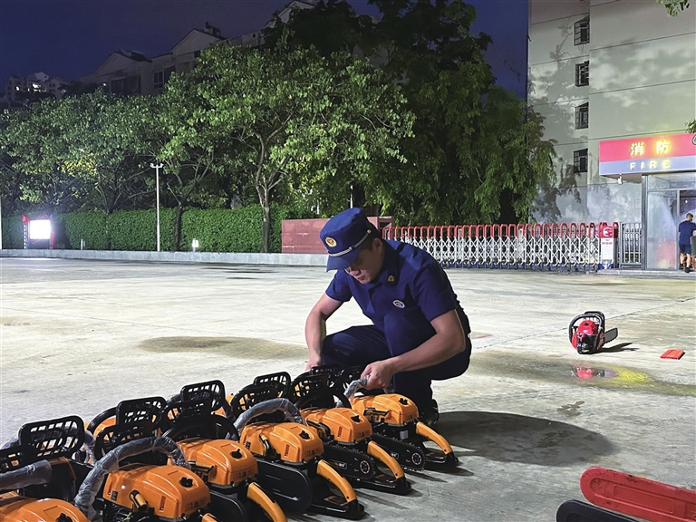 9月27日,三亚消防救援人员正在对水域救援装备、排水设备及应急通信系统等各类应急救援装备进行全面检查与维护保养。