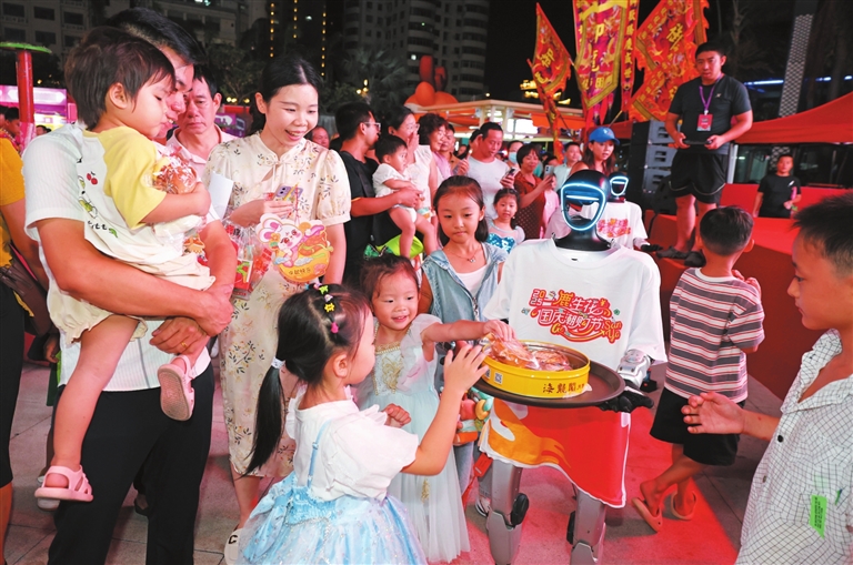 10月6日晚,在蓝海购物广场中秋节活动上,AI智能机器人向市民游客发放月饼。