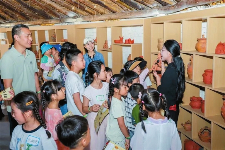 亲子家庭跟随导师走进村落,聆听非遗传承故事,触摸黎陶与黎锦,从纹样寓意到工艺演变,孩子们仿佛穿越时空,领略非遗文化的深邃内涵。非遗传承人手持工具展示钻木取火技艺,孩子们随后尝试,体验“点燃文明”的震撼;原始烧窑旁,孩子们围聚聆听窑火背后的传奇……手作环节将氛围推向高潮。在非遗传承人指导下,孩子们揉捏陶土,创作属于自己的作品。