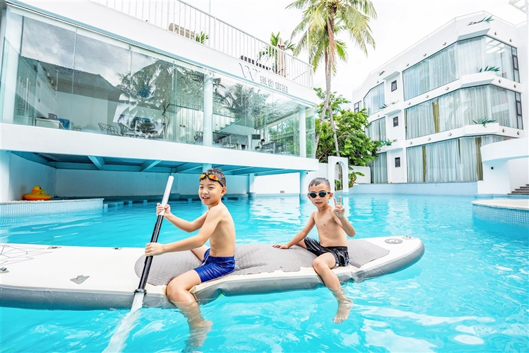 吉阳区博后村一民宿游泳池内,小朋友正在划船戏水。记者刘琪成摄