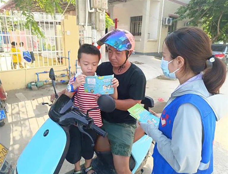 工作人员向群众发放文明手册。