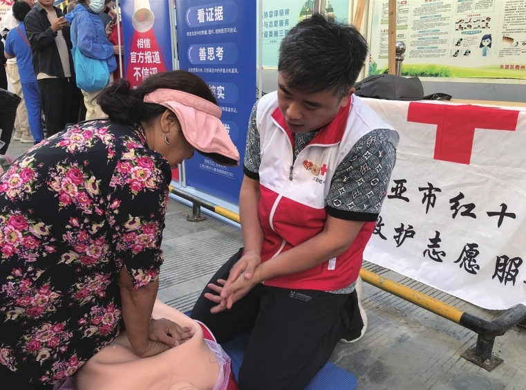 市民在志愿者的指导下进行急救实操体验。