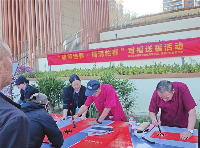 2月11日,吉阳区临春安置区(一期)锦盛雅居大门口人声鼎沸。临春片区城市更新暨城中村改造项目办联合三亚市中医院、临春社区,举办“健康义诊关爱到家”志愿服务活动暨“骏笔绘春·福满临春”写福送福公益活动,将新春祈愿与健康守护送到居民心坎上,让安置区这方“新家园”涌动着浓厚年味与民生温情。