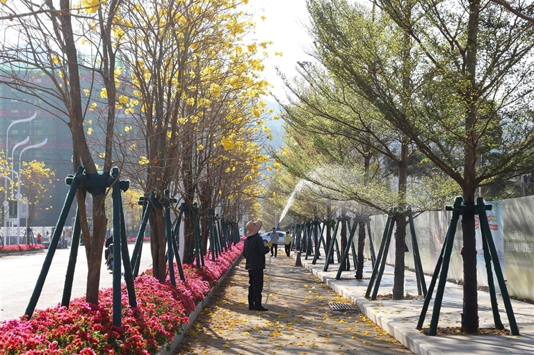 “道路建设始终秉持‘功能优先、景效融合’理念,在绿化工程中精益求精。”据三亚城运集团相关负责人介绍,螺北路是连通海罗片区海螺一路与学院路延长段的关键通道,道路两侧精心打造的黄花风铃木特色景观带,层次分明、韵律优美,盛花期满目金黄、蔚为壮观,扮靓了城市道路风貌,以高品质绿廊景观持续提升片区人居环境品质,为市民构建生态优美、舒适惬意的宜居家园。