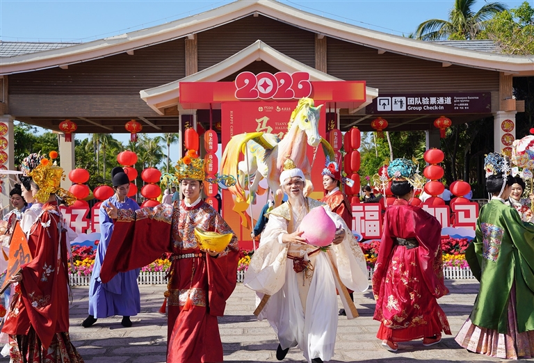 为增添节日氛围,景区特别推出好运天涯八福NPC巡游、飞马献瑞国潮巡游等特色主题活动,巧妙融合民俗风情与国潮元素,兼具互动性与观赏性,吸引众多游客热情参与。大家纷纷与角色互动打卡、拍照留念,现场年味浓郁、热闹非凡。