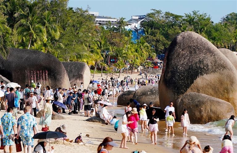 2月15日,三亚天涯海角游览区迎来春节假期客流高峰,景区内游人如织,市民游客漫步沙滩,踏浪嬉戏,在椰风海韵中尽享惬意假日。