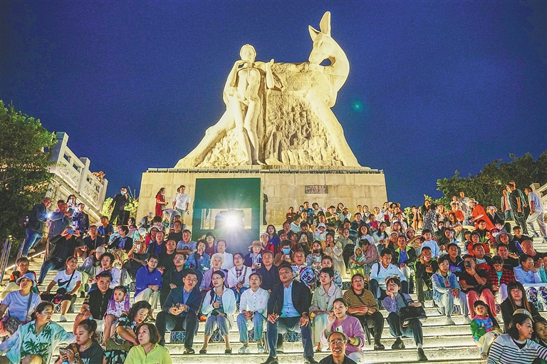 在海南岛国际电影节期间,众多市民游客在三亚市鹿回头风景区观看露天电影。海南日报全媒体记者王程龙摄